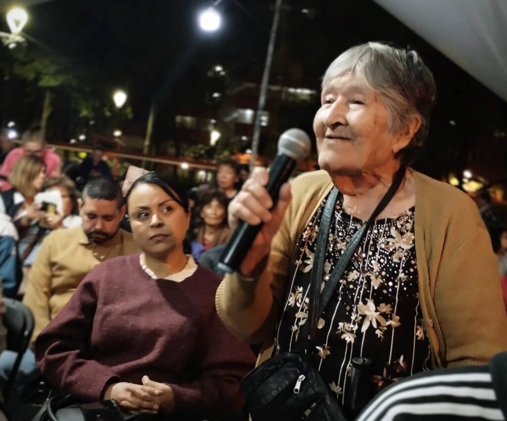 En el área de juegos del lado sur del edificio Michoacán, vecinos y representantes comunitarios escuchaban las intervenciones sobre el proyecto “Ruta, Tlatelolco mi Amor” y las obras proyectadas para la Unidad Habitacional. Había inquietudes, preguntas y la expectativa de escuchar a las autoridades territoriales.