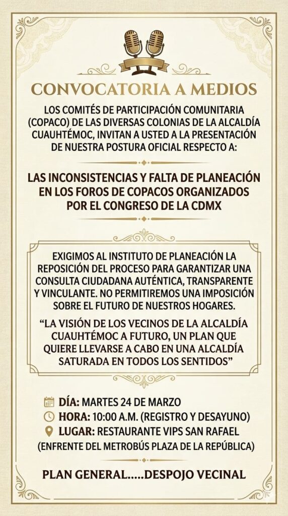 Ciudad de México, lunes 23 de marzo de 2026.- Integrantes de los Comités de Participación Comunitaria (COPACO) de diversas colonias de la Alcaldía Cuauhtémoc anunciaron la realización de una conferencia de prensa para fijar su postura oficial frente a lo que consideran inconsistencias y falta de planeación en los foros organizados por el Congreso de la Ciudad de México.